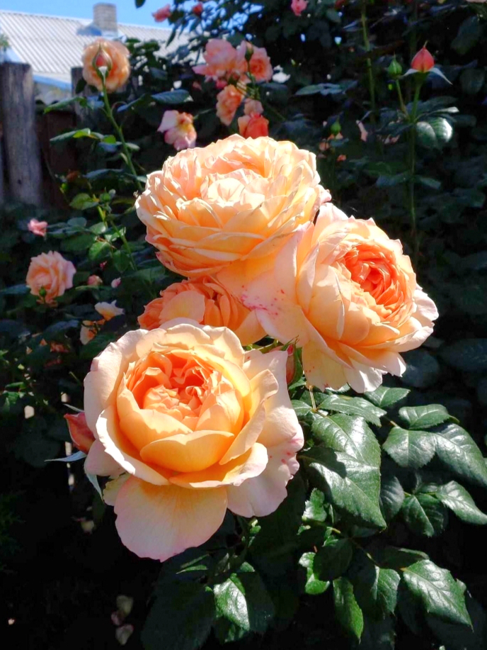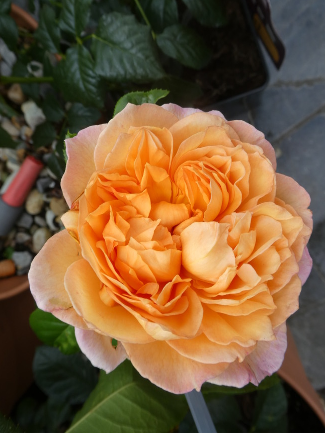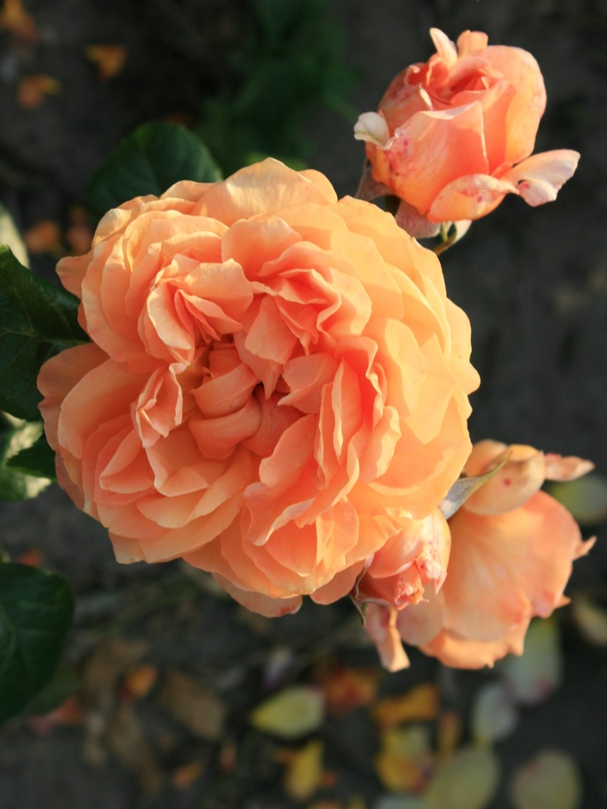 Интересны округлые и яйцевидные бутоны, имеющие сложный розово-оранжево-жёлтый оттенок. Распустившиеся цветки окрашиваются в оранжево-абрикосовые тона цвета заката, с кремовыми внешними лепестками. Сами розы имеют привлекательную старинную форму, они довольно крупные, в диаметре достигают 8-10 сантиметров. В густомахровой чаше либо розетке цветка содержатся от 40 до 60 лепестков. Появляются цветки одиночно либо собираются в небольшие, малоцветковые соцветия.