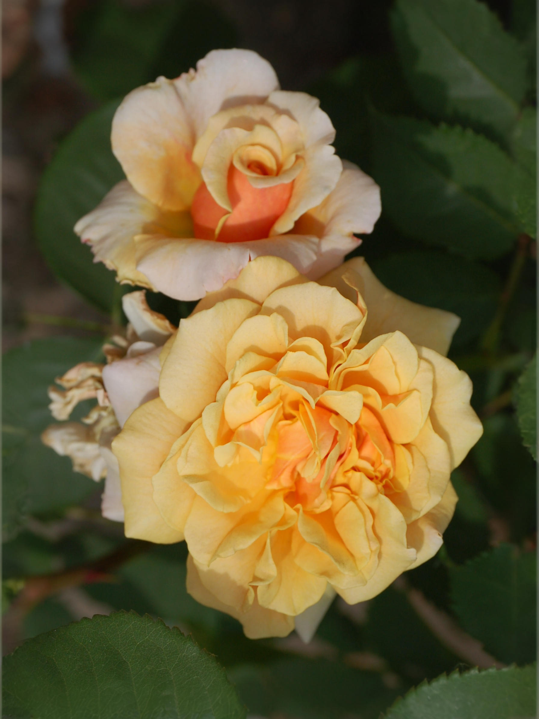 Карамелла – роза шраб, с прямостоячими побегами, ветвистая, вырастает в высоту до 120 см, в ширину разрастается до 70 см. Кусты имеют крупную и блестящую густую листву темно-зеленого окраса с оттенком хаки. Цветы на кусте собраны в малоцветковые соцветия от 1 до 3 единиц. Крупный бокаловидный желтый бутон с оранжевыми мазками разворачивается в густомахровый чашевидный, а иногда и квартированный цветок с очень интересной расцветкой. Основной цвет желтый, лепестки от светло-янтарного до желтого. Края лепестков волнистые, их в одном цветке от 80 до 85 штук. А сама роза довольно крупная, до 10 см в диаметре. Розы Карамелла обладают легким ароматом. Он мягкий, ненавязчивый, с медовыми и фруктовыми нотами.