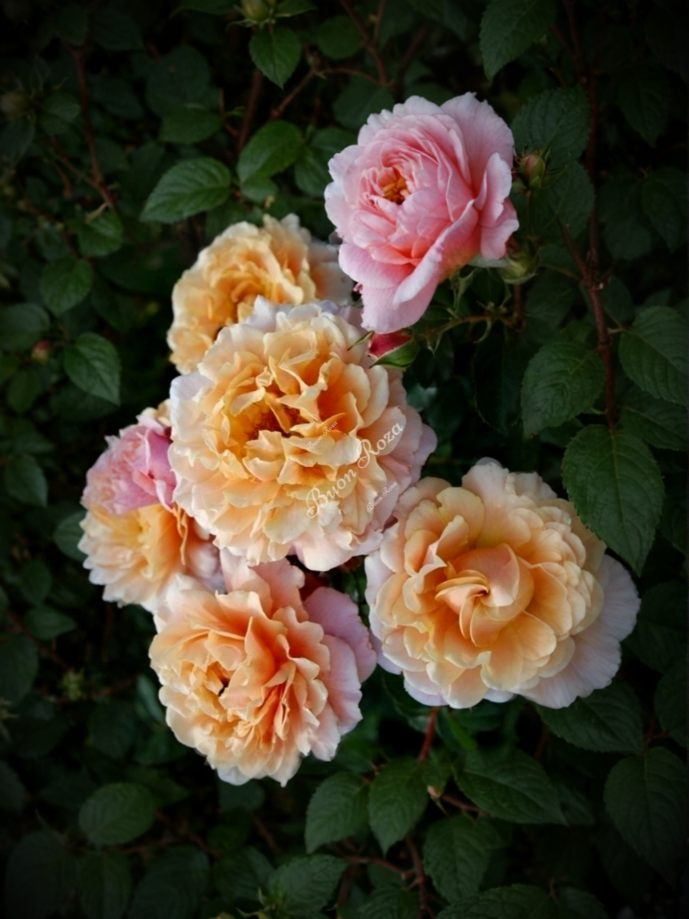 Абрикосово-розовые с умеренным приятным ароматом цветы появляются в небольших соцветиях. Диаметр цветка 7-9 см. Цветение повторное, в течение всего сезона. Листва темно-зеленая, блестящая. Куст сильнорослый, прямостоячий, выносливый, высотой от 120 до 150 см, шириной до 120 см.
