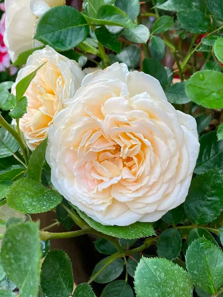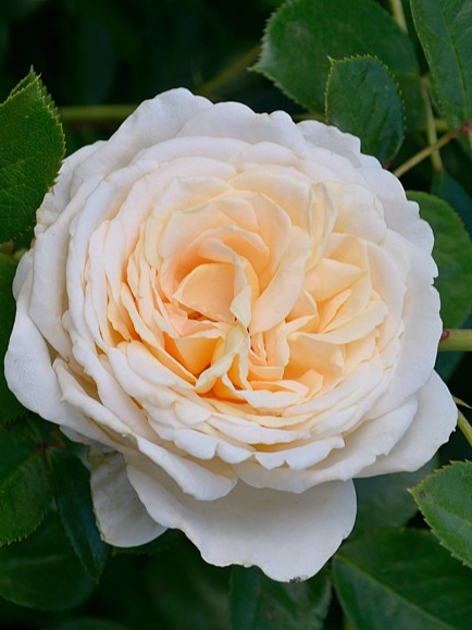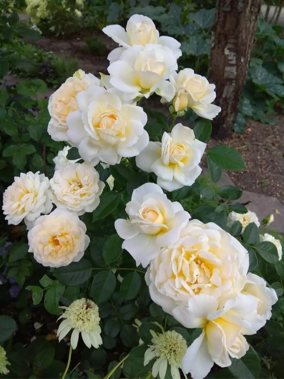 Сочетание бледно-желтого и кремового усиливается к центру цветка. На ярком солнце кремовый оттенок выгорает и, прежде чем лепестки опадут, цветок становится белым. Для лепестков таких нежных оттенков они на редкость хорошо переносят дождливую погоду, только изредка на них появляются бурые пятна. Шаровидные бутоны раскрываются в очаровательные округлые густомахровые цветки. Центр остается закрытым, и цветки долго не отцветают. Обладают приятным запахом, похожим на сочетание мирры и яблока. Кисти из 7-9 цветков распускаются многие недели, цветет очень обильно. Куст компактный, густой, мощный. Цветоносные побеги достаточно мощные, чтобы удерживать цветки в вертикальном положении. Листья очень крупные, темно-зеленые.