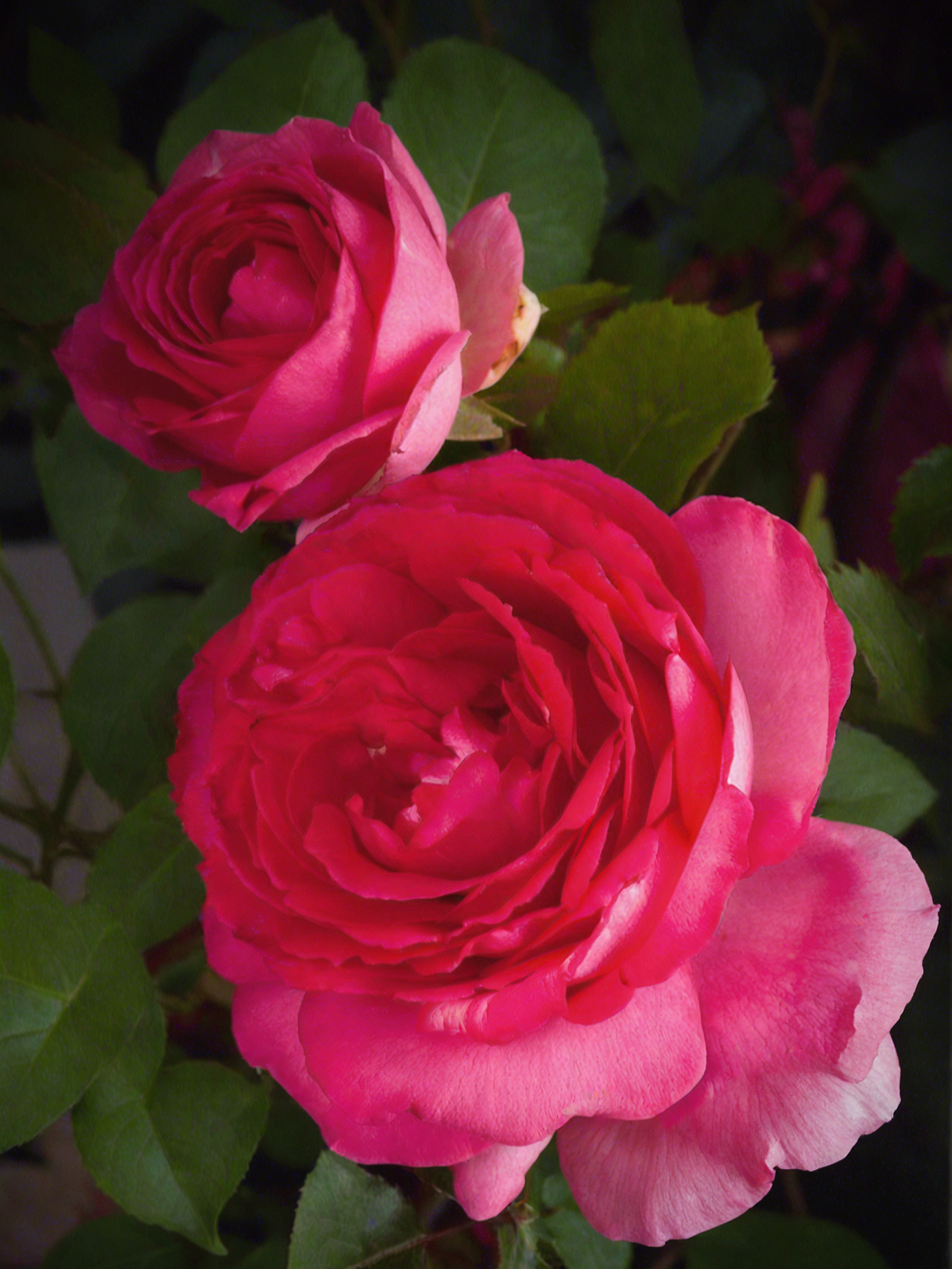 Цветки плотно набитые, с большим количеством лепестков – по 70-80 шт., густо завернутых в романтические розетки. Цветы очень крупные, до 11-13 см. Окраска сочная, горячая – цикламеново-розовая, с серебристой наружной стороной. Аромат средней силы.