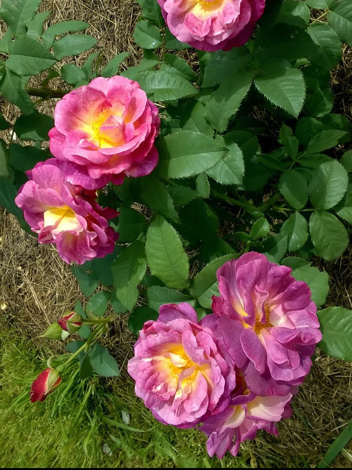 Окрас цветка – фиолетовый с синими оттенками, центр выглядит как жёлтая середина, основная палитра цветка – фиолетовый и синий оттенки. Цветонасыщенность – затемнённая, пестроты и двухцветности у этого сорта нет. По габаритам цветок относится к особо крупным: средний диаметр – 14 см, махровость – обычная (30 лепестков на бутон). Цветки расположены в соцветиях по 3-5 бутонов на каждое. Этот сорт относится к малоцветковым растениям, обладает выраженным запахом жасмина. Полураскидистый куст, высота – 90 см, ширина – 60 см, с зелёными листьями неглянцевой текстуры.