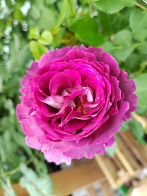 Цветки от розово-фиолетовых до тёмно-фиолетовых, густомахровые, более 40 лепестков, в соцветиях. Аромат очень сильный. Цветение повторное. Куст густой, хорошо разветвлённый, высотой 60-80 см и шириной 40 см. Листва темно-зеленая яркая, глянцевая, с хорошей устойчивостью к заболеваниям. Рекомендуется сажать в местах, защищённых от сильного солнечного света, в полутени. Использование: массив, срезка.