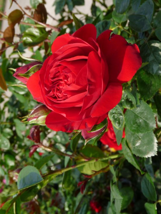 Стебли довольно толстые, крепкие, но вместе с этим пластичные. Среди преимуществ культуры стоит отметить устойчивость к самым распространённым заболеваниям, например, мучнистой росе. На солнце бутоны не выгорают, а после дождя на лепестках не остаётся разводов. Листва довольно густая. Цветение очень обильное и повторяется несколько раз вплоть до сентября. Кустарник можно использовать в качестве элемента оформления сада, а можно применить для декорирования фасадов зданий. Густая листва и яркие насыщенные цветы скроют все изъяны на стене постройки. Также можно спрятать под розами сухое дерево или старый столб на участке.