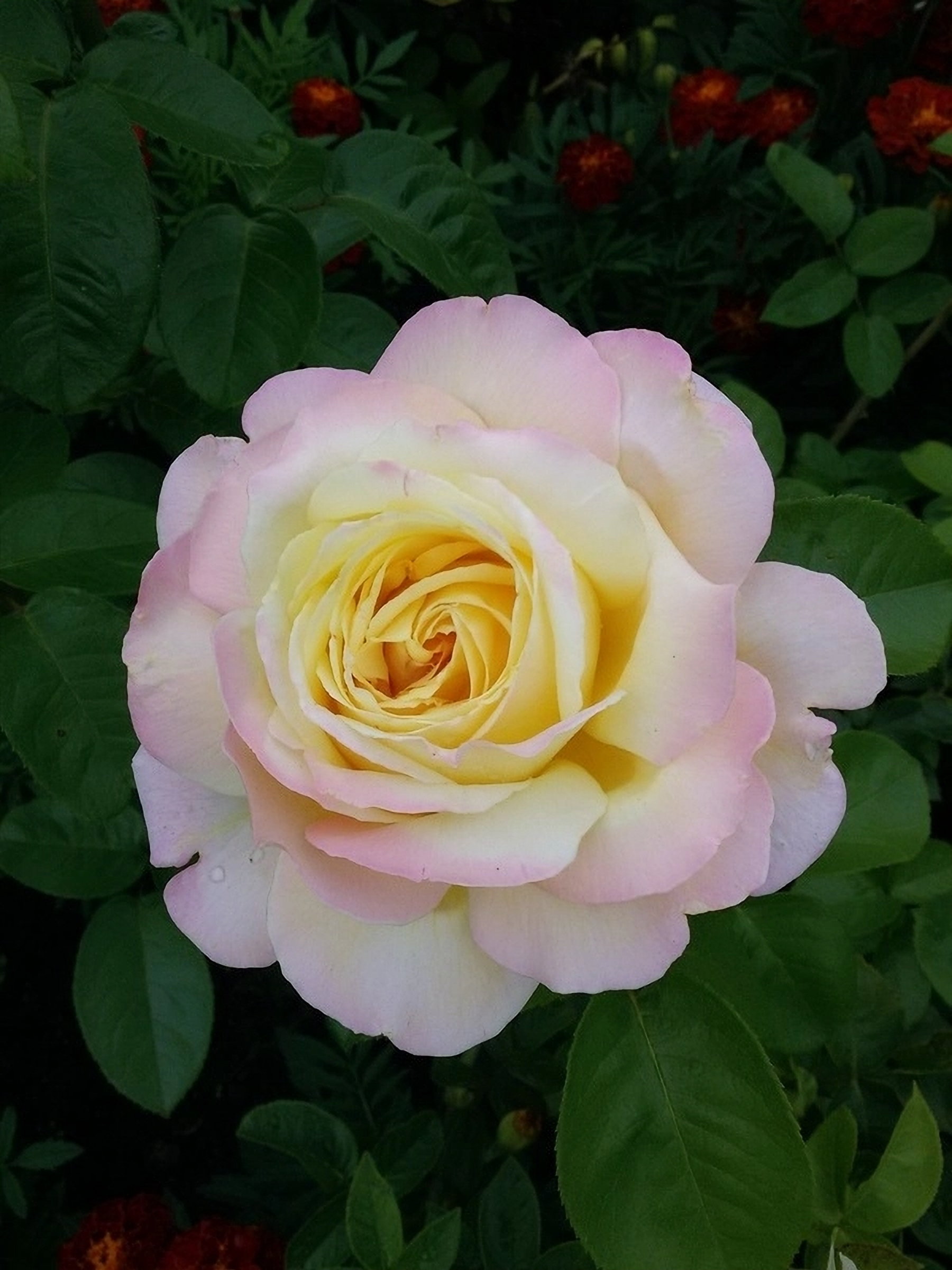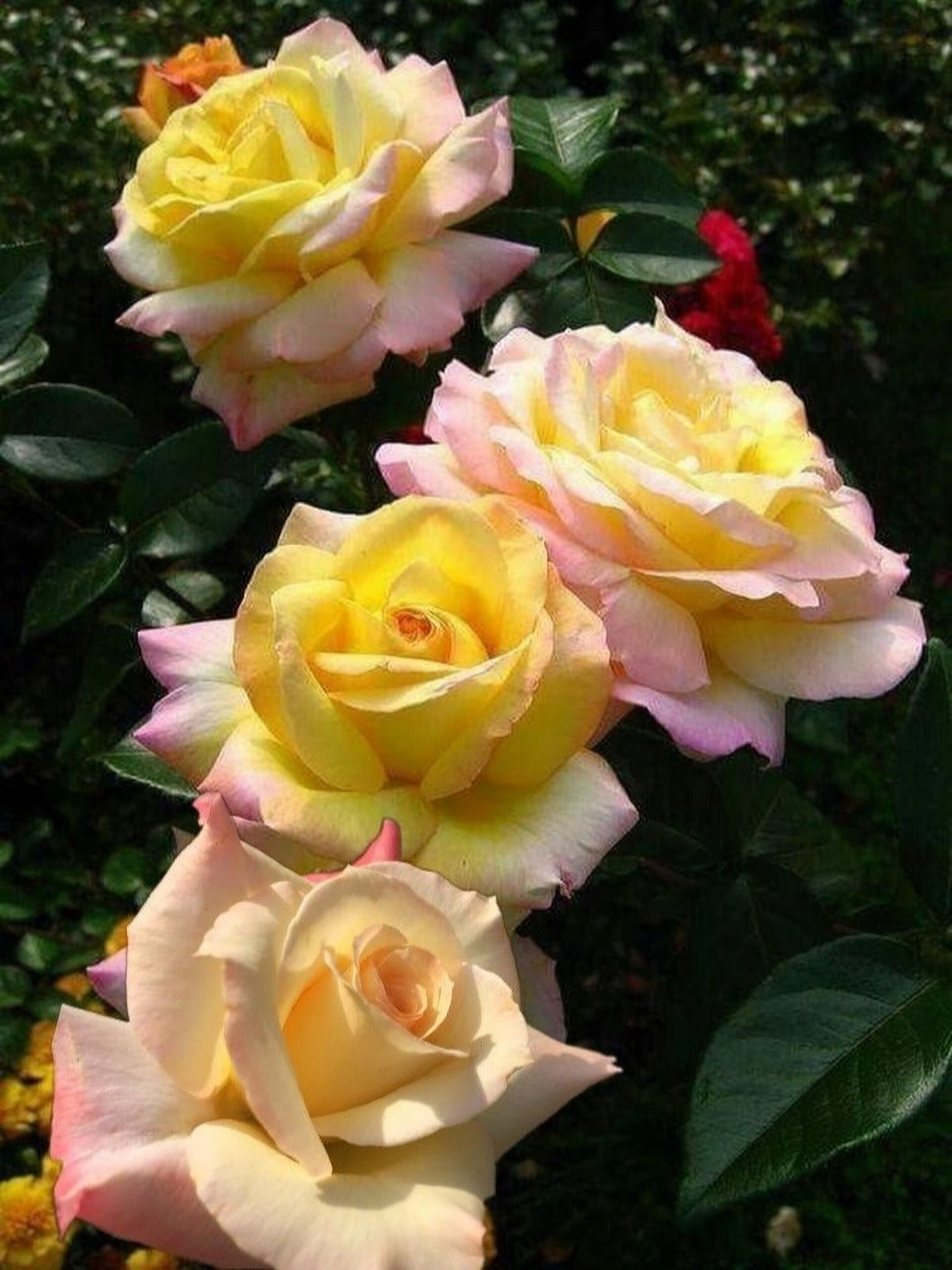 Глория Дей считается эталоном среди чайно-гибридных сортов. Куст сильнорослый, классической прямой формы, ветвистый, мощный, высотой 100 — 150 см. Ширина куста до 90 — 125 см. Побеги длинные, со средним количеством крупных шипов. Бутон очень крупный. Цветки сохраняют привлекательный вид во всех стадиях роспуска, начиная с высокого элегантного бутона бокаловидной формы и заканчивая стадией полного раскрытия, в котором приобретается пионовидная форма. Диаметр розы — 13 — 16 см. Цветы окрашены в нежно-жёлтый цвет, который ближе к краям приобретает розово-красную или малиновую окантовку. Аромат лёгкий и приятный. Сорт относится к повторноцветущим. Зимостойкость и иммунитет розы хорошие.