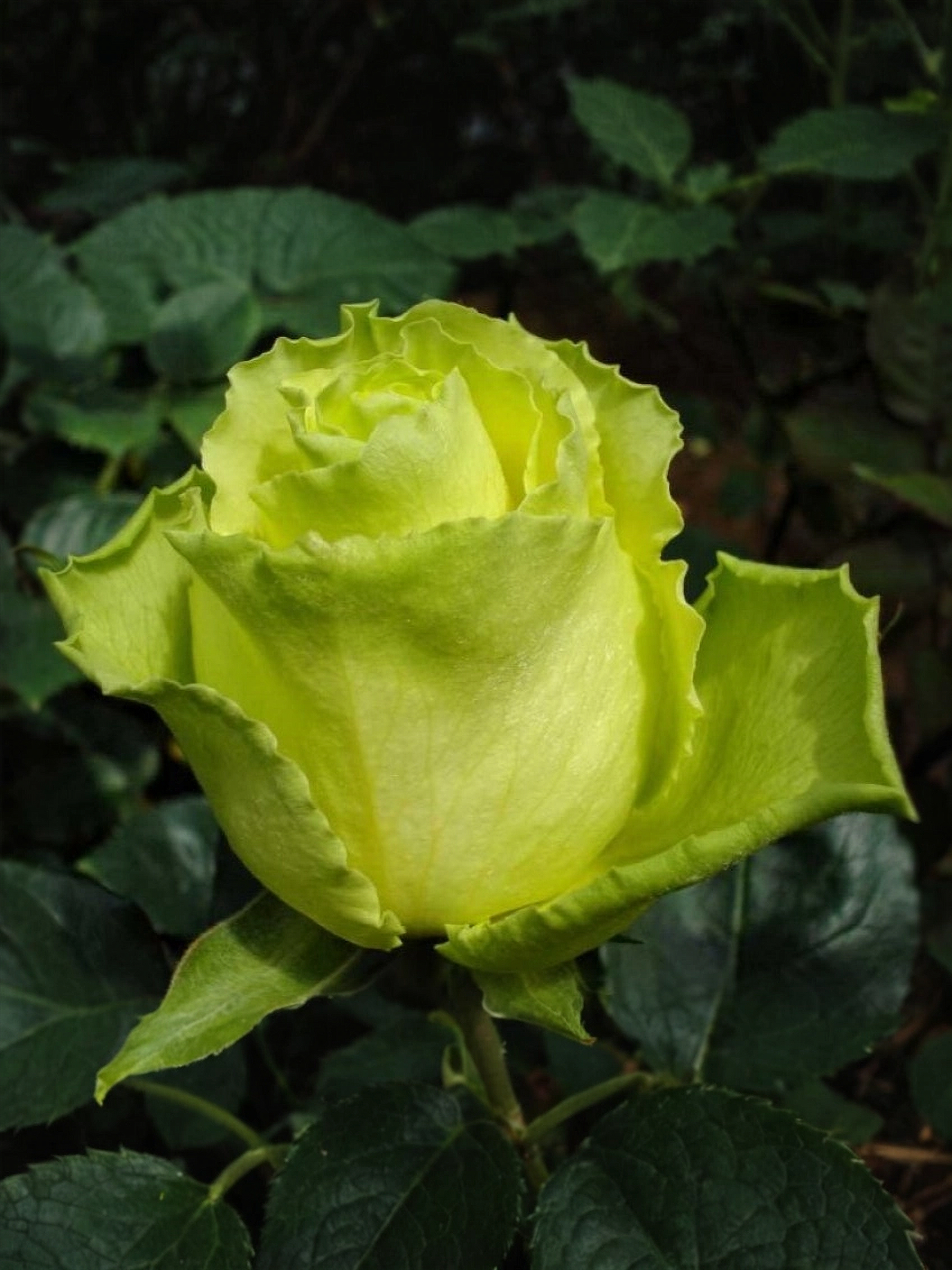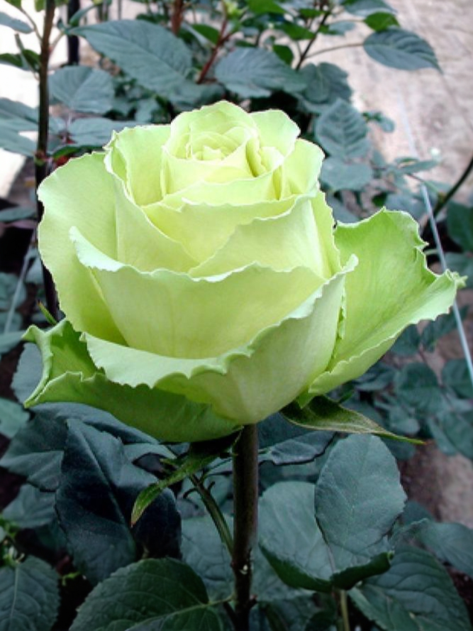 Роза с бледно-желто-зелеными цветками диаметром 8-10 см. Цветки махровые, с чуть волнистыми лепестками, распускаются из бокаловидных бутонов в основном поодиночке. Цветение повторное.