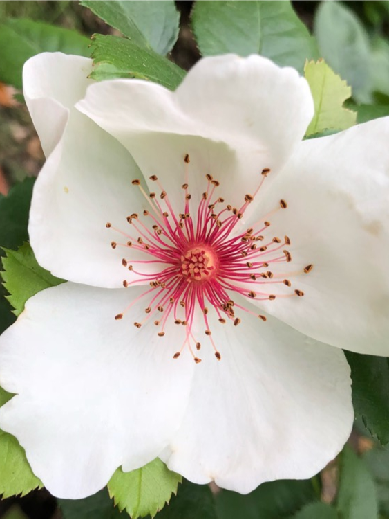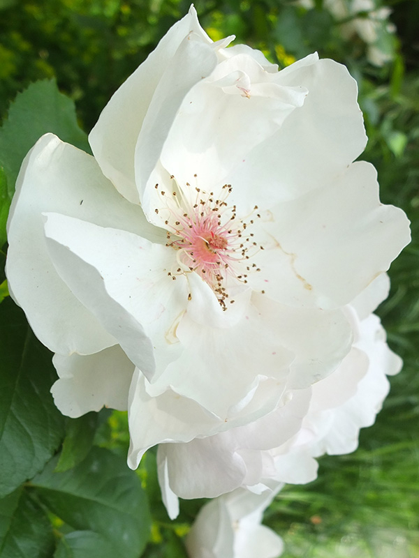 Цветки плоскочашевидные, крупные, диаметром 9–10 см, с полумахровой структурой, напоминающей кувшинку. Основная окраска лепестков белая с розовым оттенком. Крупные тычинки красные. Бутоны вытянутые, заостренные. Они окрашены в нежно-розовый тон с абрикосовым оттенком. У этой розы сильный, очень интересный аромат. В нем преобладают ноты лимона и мускуса.