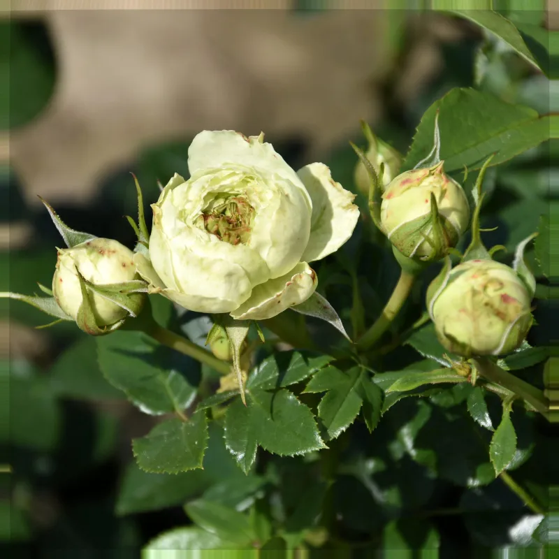 Роза Tantau с восхитительными цветками в форме старинных роз, кремово-зеленоватыми в начале цветения и практически совсем белыми ближе к отцветанию. Устойчивость к дождю высокая. Цветение повторное, поодиночке и в соцветиях. Куст гармоничной формы, округлый. Листва тёмно-зелёная, глянцевая. Сорт подходит для рабаток, групп, а также для срезки.