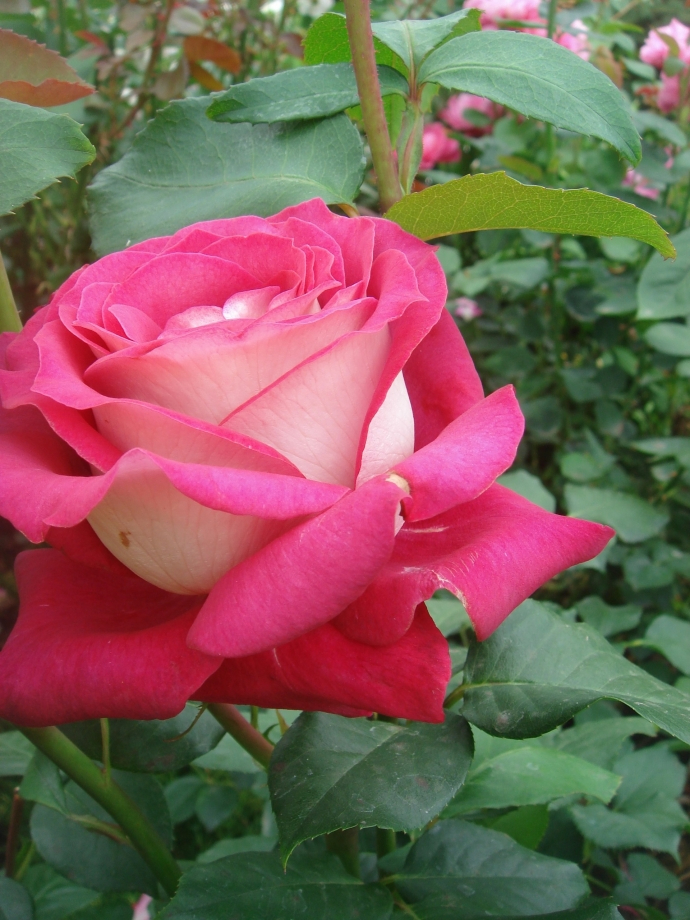 Роза Моника Белуччи посвящена одной самых гламурных актрис. Бутон — кремовый с малиновыми полосами, округлый. Расцветка цветка красивая и редкая — насыщенно розовый сверху и сливочно-желтый на обратной стороне лепестков, плюс интенсивный запах с преобладанием анисово-перечных ноток. Цветок состоит примерно из 50 лепестков и имеет диаметр 12-14 см. Листья широкие, матовые, с хорошей устойчивостью к болезням.