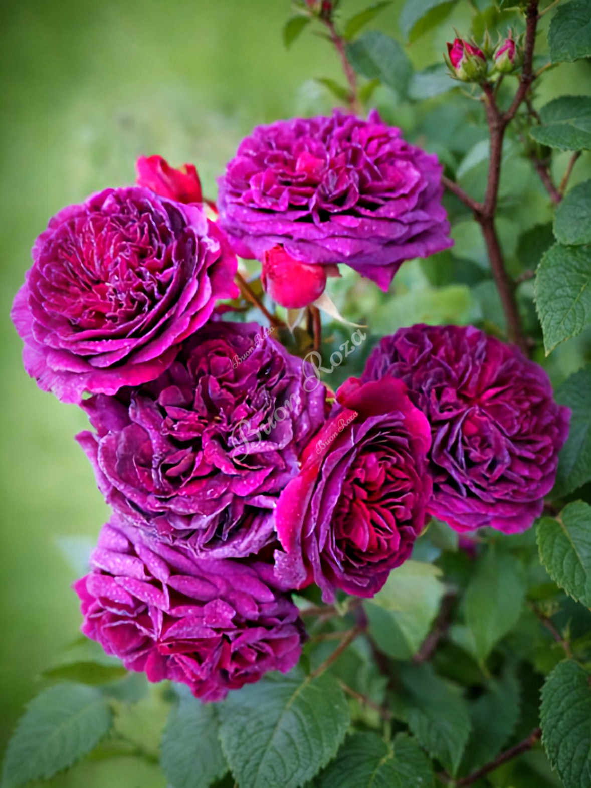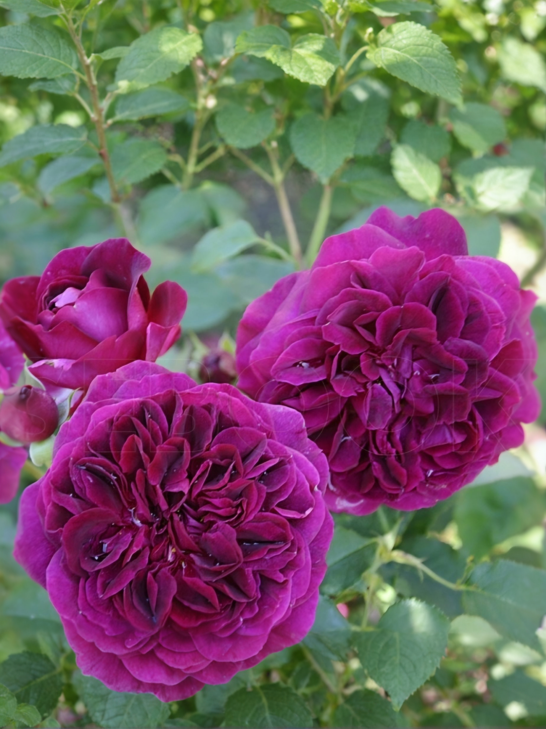 Светло-малиновые бутоны раскрываются в темно-малиновые глубоко бархатные цветки с более светлыми внешними лепестками. Густомахровые цветы по мере распускания становятся темно-красными бархатистыми, в начале цветения имеют форму большой чаши, затем становятся более открытыми. Цветы большие диаметр цветка 8 — 10 см , аромат цветов сильный, старой розы с фруктовыми нотками ежевики, черники и сливы.