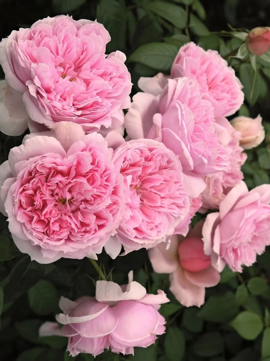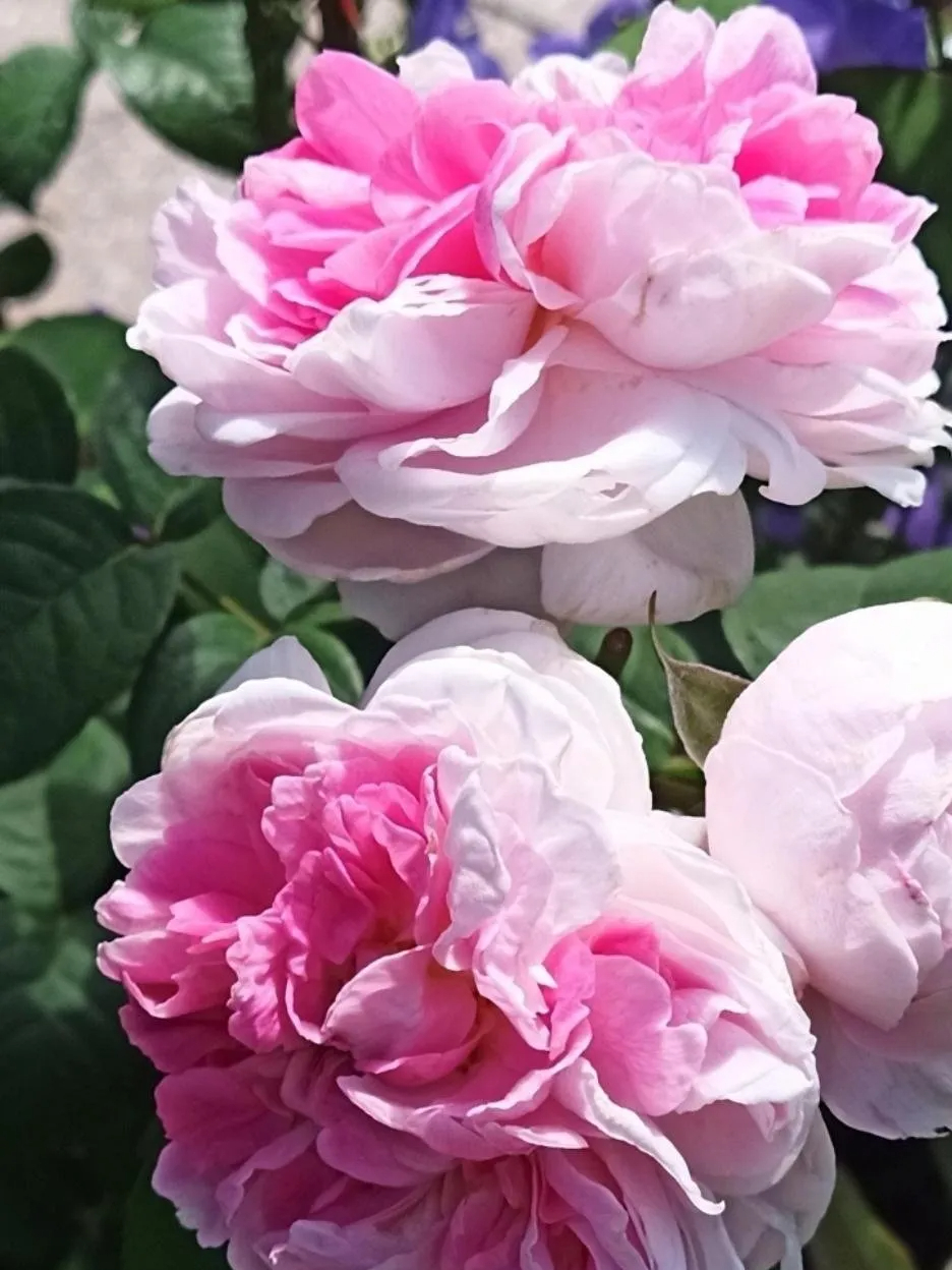Цветы нежные, изящные и очаровательные — розовые с более светлыми наружными лепестками, которые раскрываются в красивые четко очерченные махровые чаши (более 41 лепестков) размером 10-12 см. Аромат от сильного до умеренного.