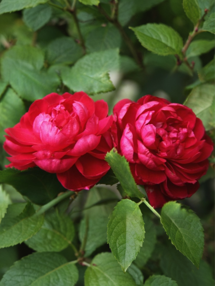 Раскрывшиеся розы достигают 8-сантиметровой отметки в диаметре, формируются в малоцветковых кистях по 1-4 штуки. Множество ярко-красных лепестков, их около 66, уложены симметрично, наподобие старинных галльских роз. При этом они загибаются к центру, очень напоминают пионы. По мере того как цветок распускается, лепестки постепенно отгибаются вниз. Цветы имеют легкий фруктовый аромат.