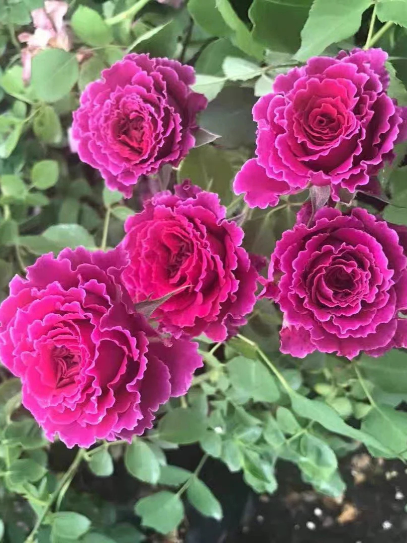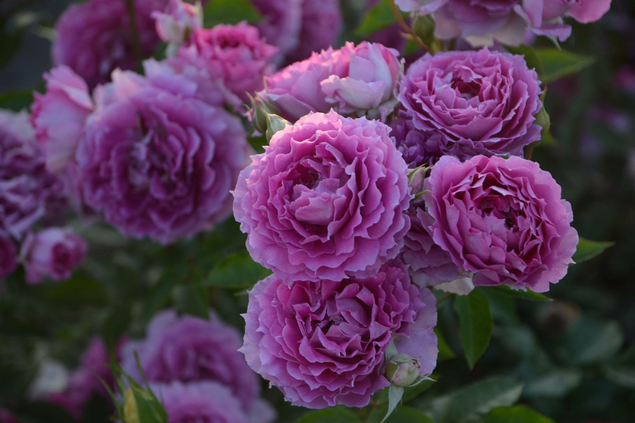 Цветы розы Рамукан от темно-розового до пурпурного цвета, более красного тона в центре и с легким розовым напылением по краям лепестков. Легкий, нежный аромат. Цветки среднего размера, сильно махровые, с более ста красиво уложенных волнистых лепестков. Диаметр цветка 6-8 см. Цветение в соцветиях в течение сезона с хорошим повторным цветение. Высота куста около 80 -100 см. Листва матовая зеленая. Устойчивость к вредителям и болезням хорошая.