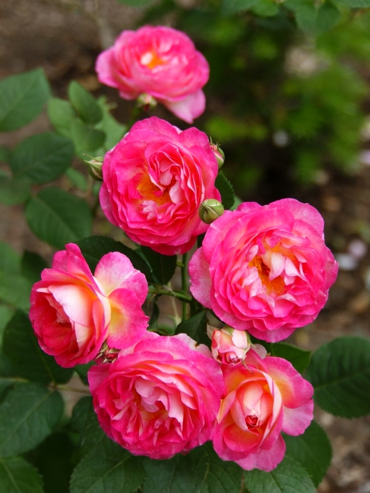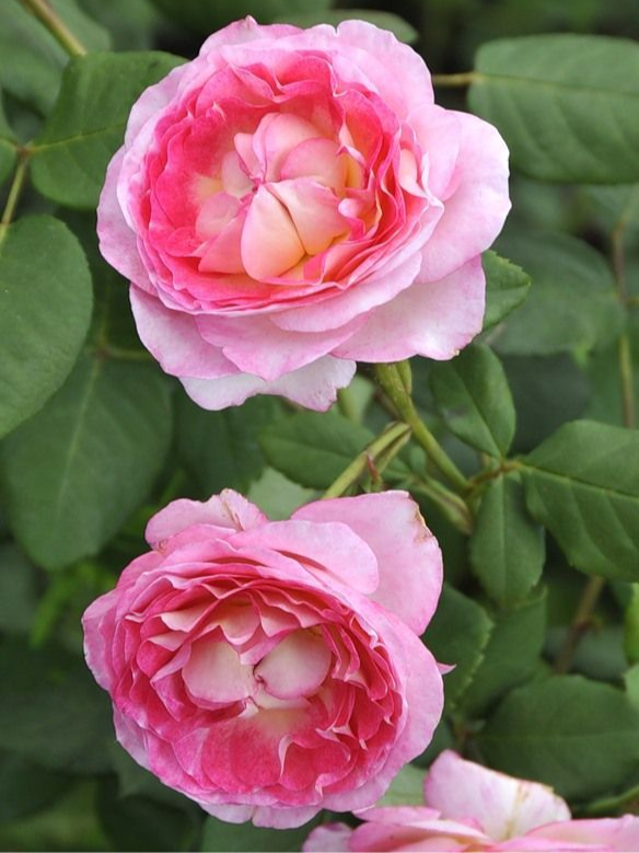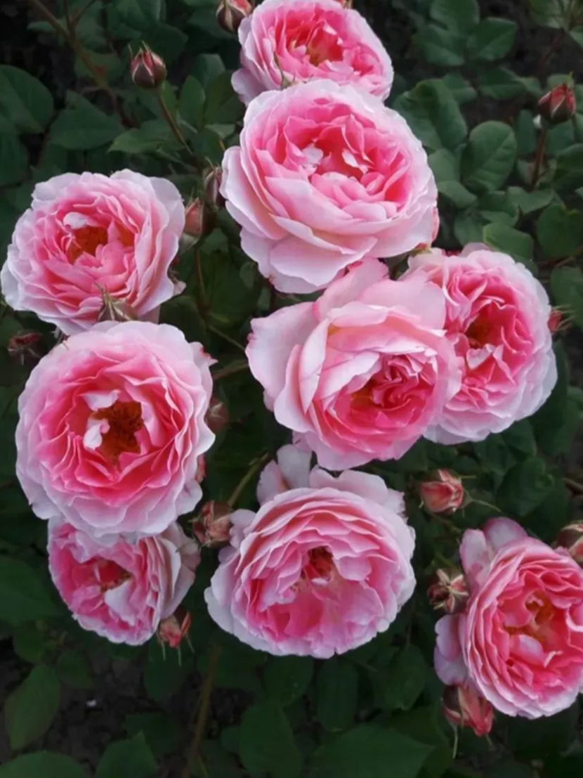 В закрытом виде цветки имеют шаровидную форму. А вот форму раскрывшихся цветков обозначают как старинную. Диаметр от 6 до 8 сантиметров указывает на средние размеры. В одной розе собрано от 17 до 25 красочных лепестков. Бутоны растут в соцветиях по 3-5 штук на каждом побеге (малоцветковые соцветия). Особенность сорта Мадам де Сталь – сильный фруктовый аромат.