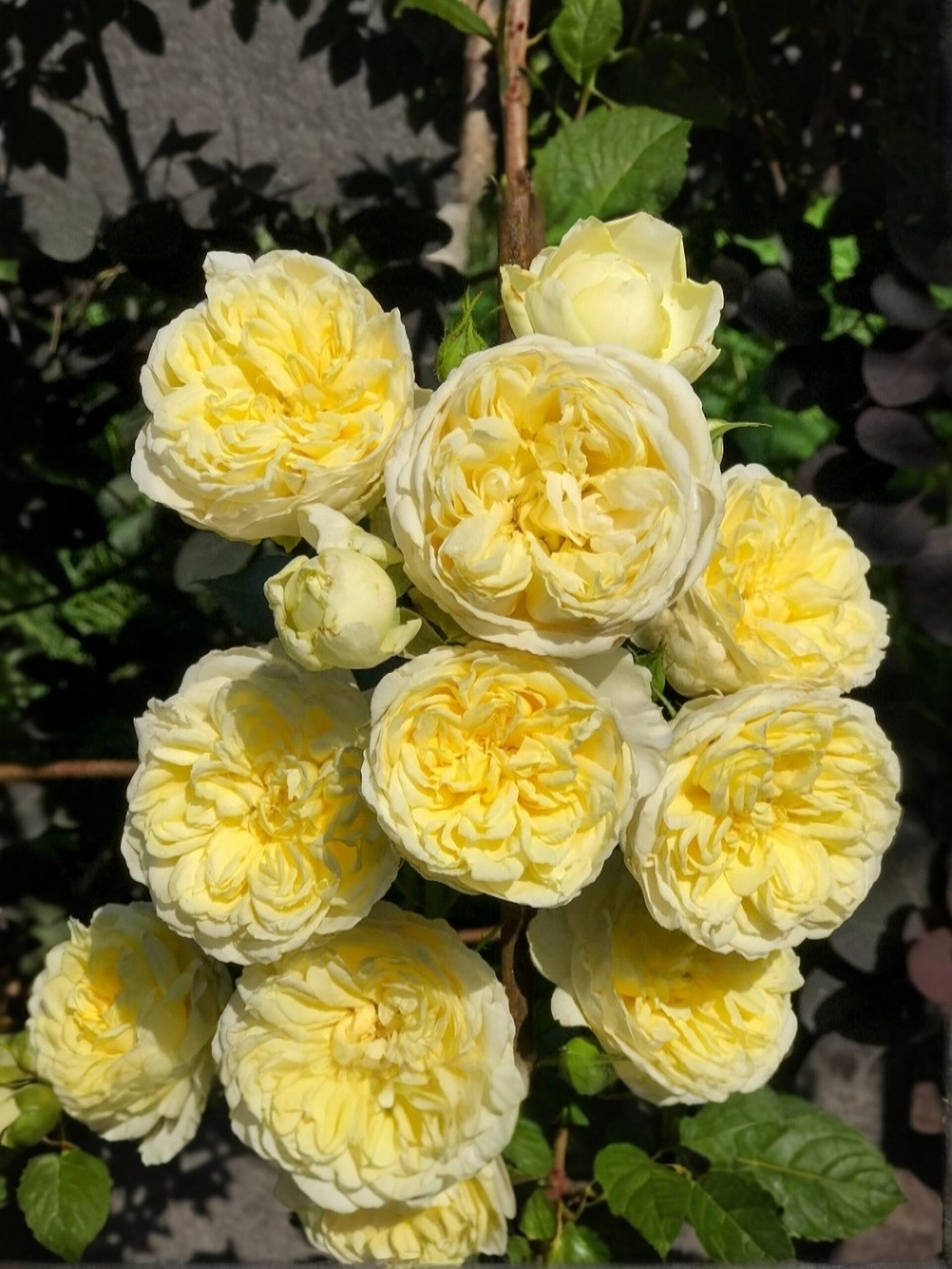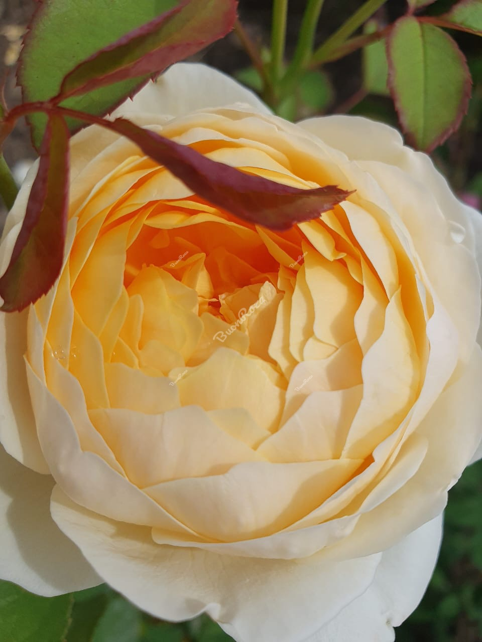 Округлые бутоны желтого цвета превращаются в чашевидные цветки, чья основная окраска состоит из палитры бледных желтых оттенков: от сливочных и кремово-белых на внешних лепестках до медовых в центре. Благодаря такой игре полутонов цветок кажется подсвеченным изнутри. Некрупные (6-8 см) густомахровые бутоны сложены из огромного количества тончайших, шелковистых, слегка закрученных мелких лепестков (от 80 до 150-170). Расположение на стебле одиночное или в соцветиях из 1-3 бутонов. Роза обладает изысканным ароматом средней силы чайной розы с нотками пряностей и мирры.