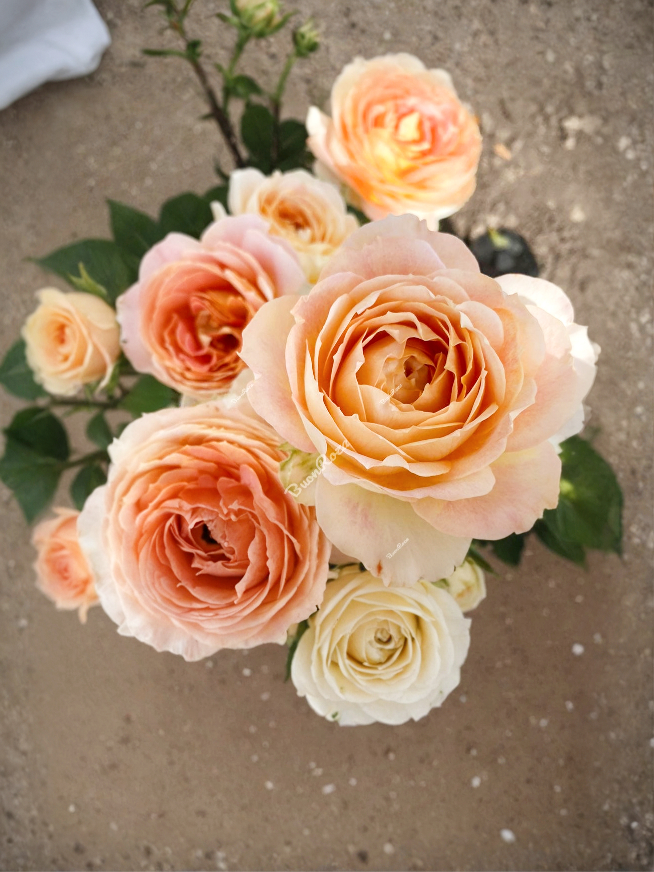 Бутоны зеленовато-желтые, округлые, заостренные, элегантные, как у чайно-гибридных роз, раскрываются в цветки старинной формы. Цветок почти белый, светло-желтый в центре с белой каймой или нежно кремовый , переходящий к центру в персиковый оттенок. Цветок средний от 8 до 10 см, густомахровый, более 41 лепестка в одном цветке. Аромат со сладкими нотками от слабого до сильного. Цветение непрерывное, продолжительное, небольшими сооцветиями на одном цветоносе по 2 — 5 цветков одновременно. Куст высокий, пушистый, высотой от 120 до 185 см. Листва средняя, ​​полуглянцевая, темно-зеленая.