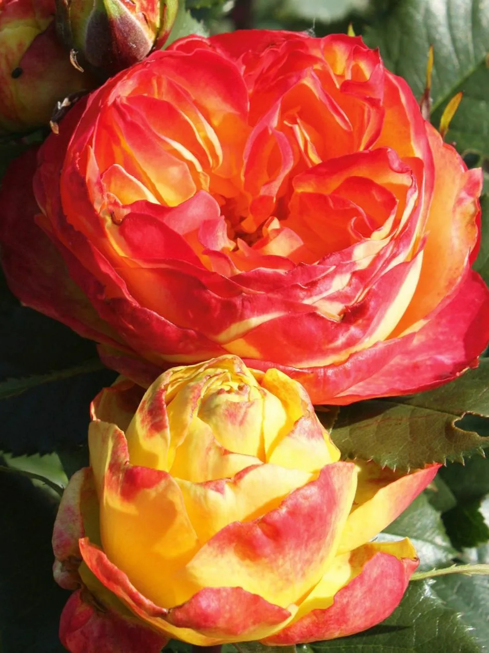 Цветки расположены в соцветиях и имеют диаметр от 8 до 10 см. Они ярко-желтые, а при раскрытии бутонов края лепестков окрашиваются в красный цвет, что создает эффект двойной окраски.